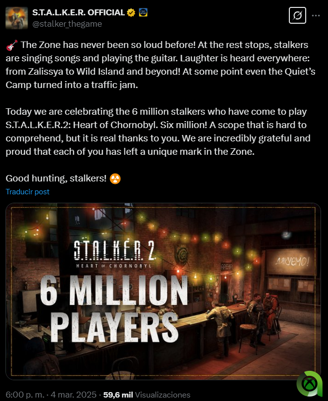 Y es que el estudio desarrollador ha anunciado a través de su perfil en X/Twitter que su obra ha alcanzado la friolera de 6 millones de jugadores en total, entre Xbox Series X|S y PC. A la consecución de este importante logro, indudablemente, ha ayudado la inclusión del juego en Xbox Game Pass Ultimate desde el día de su salida. Teniendo en cuenta que el lanzamiento de STALKER 2 tuvo lugar hace menos de 4 meses, estamos hablando de un hito que pocas veces se logra en la industria.