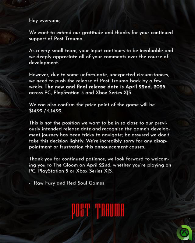 Como veis en el comunicado, el equipo español de Red Soul Games comunica que debido a «inesperadas circunstancias» deben retrasar el lanzamiento de nuevo. La nueva fecha escogida será el próximo 22 de abril. El lanzamiento sigue programado para todas las consolas y PC. Aducen motivos relacionados con ser un estudio pequeño y creemos que sea probable debido a cuestiones de pulido. Nos sabe mal tardar más en jugarlo, pero esperemos que salga sin errores y tengamos el gran juego que parece que va a ser.