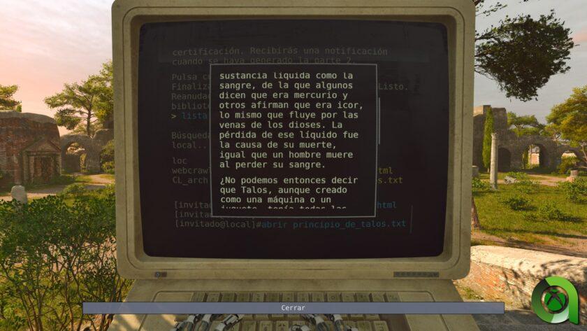 Entonces, ¿Qué debemos hacer? Por el momento, lo más coherente es hacer lo que esa voz nos pide que hagamos, pero siempre cautelosos de lo que pudiese ocurrir. Comenzamos nuestra andadura en lo que se representa visualmente como la Grecia Clásica, en donde tendremos que alcanzar una serie de piezas de puzle denominadas sigilos. Pero durante todos los niveles y fases que propone The Talos Principle Reawakened, existe una CPU con la que podremos interactuar, una en la que encontraremos textos antiguos mediante el Archivo de la Biblioteca.