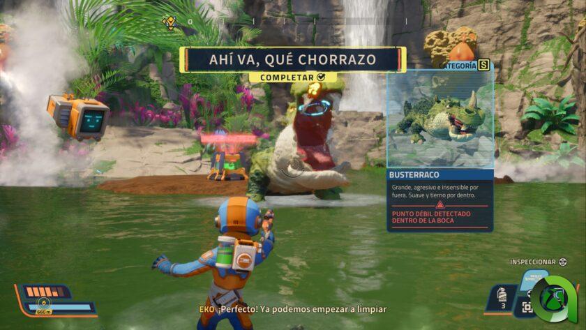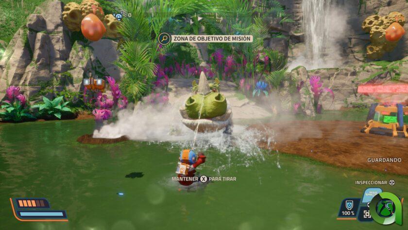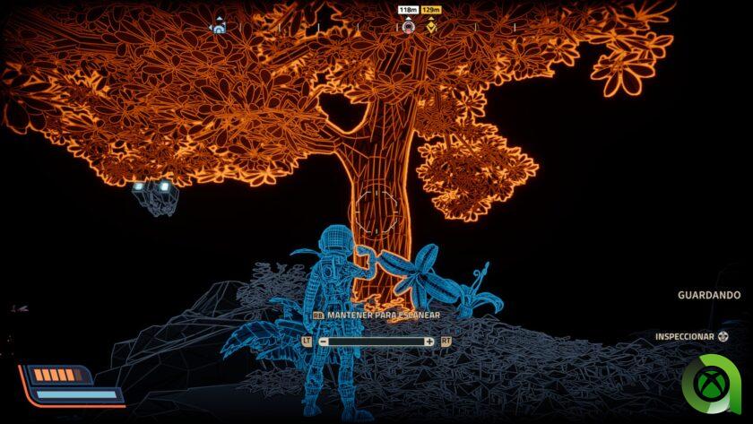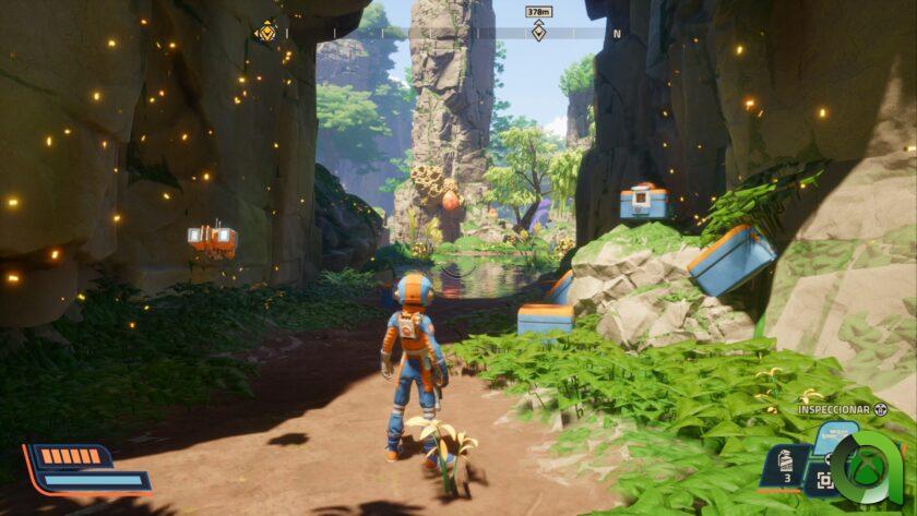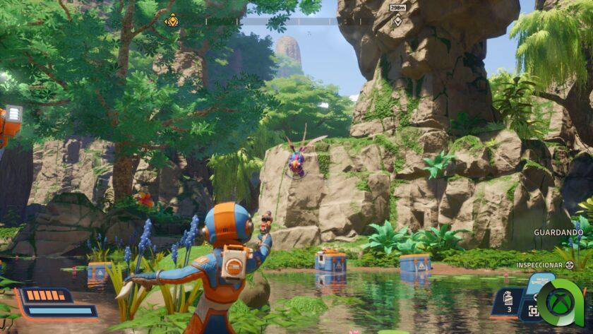 Pero en lo que a la exploración respecta, tenemos disponible desde el principio un visor que nos permitirá escanear casi cada elemento del mapa. Esto será imprescindible para poder adquirir nuevas habilidades/mejoras, o bien para simplemente poder avanzar. La sensación de progresión se siente satisfactoria al desbloquear progresivamente nuevo equipamiento y mejoras que nos permitirán realizar acciones previamente imposibles. Empezamos con una simple pistola «láser», para luego acceder a una manguera de agua que nos permitirá regar ciertas plantas para así matarlas o hacerlas crecer en nuestro beneficio. También una cuerda con la que poder capturar a nuestros enemigos o un gancho gracias al cual podremos sujetarnos a ciertos puntos aéreos. Todo esto entre muchas cosas más.
