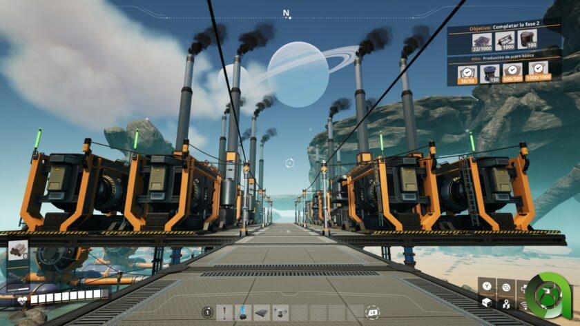 A lo largo de nuestra aventura en este astro extraterrestre, pasaremos de picar a mano con pequeños taladros portátiles para fabricar cosas tan básicas como tornillos a producir ordenadores cuánticos y utilizar la energía nuclear para dar electricidad a toda nuestra fábrica. Aunque esto pueda asustar, el juego cuenta con varios niveles o «hitos» tecnológicos por los que pasaremos. Para poder avanzar en estos hitos, debemos entregar una serie de materiales más o menos complejos depende de lo avanzados que estemos. Podremos avanzar X número de hitos en función de si hemos completado la tarea principal, que no es otra que entregar materiales complejos a un ascensor espacial. A través de ellos, iremos adquiriendo experiencia para los siguientes retos que se nos presentan.